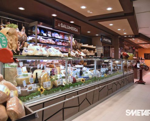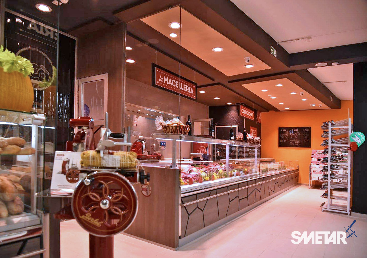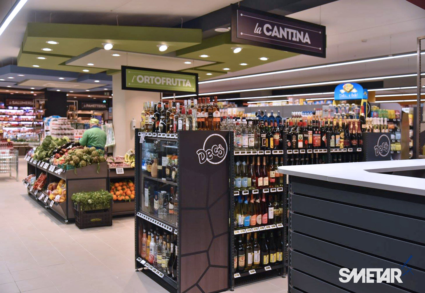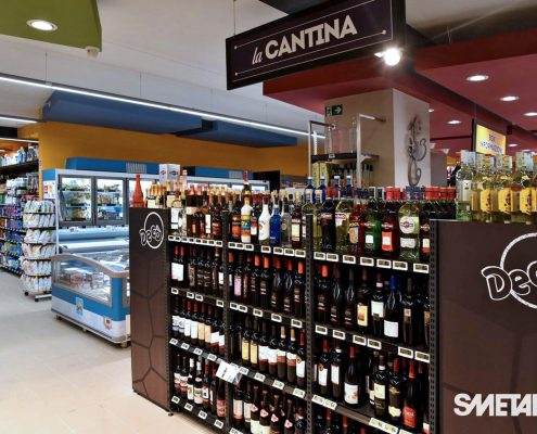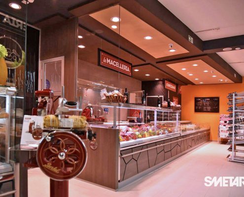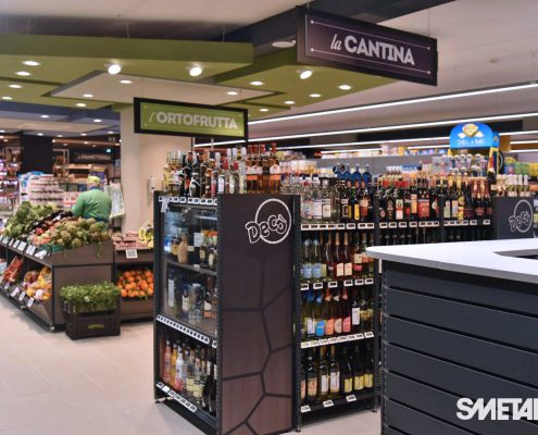 Il progetto iniziale di Smetar prevedeva la realizzazione di un punto vendita fresco ed innovativo, una quinta scenica d’impatto che mettesse in risalto i prodotti del territorio. Da qui la decisione di creare un layout suddiviso per aree dal colore diverso con un effetto prospettico, a partire dalla zona ortofrutta, per poi arrivare alla gastronomia/panetteria speculare alla macelleria, passando per l’area dei freschi, fino a giungere alla cantina predisposta di un mobile per la spillatura self-service dei vini, ed infine all’area casse.
