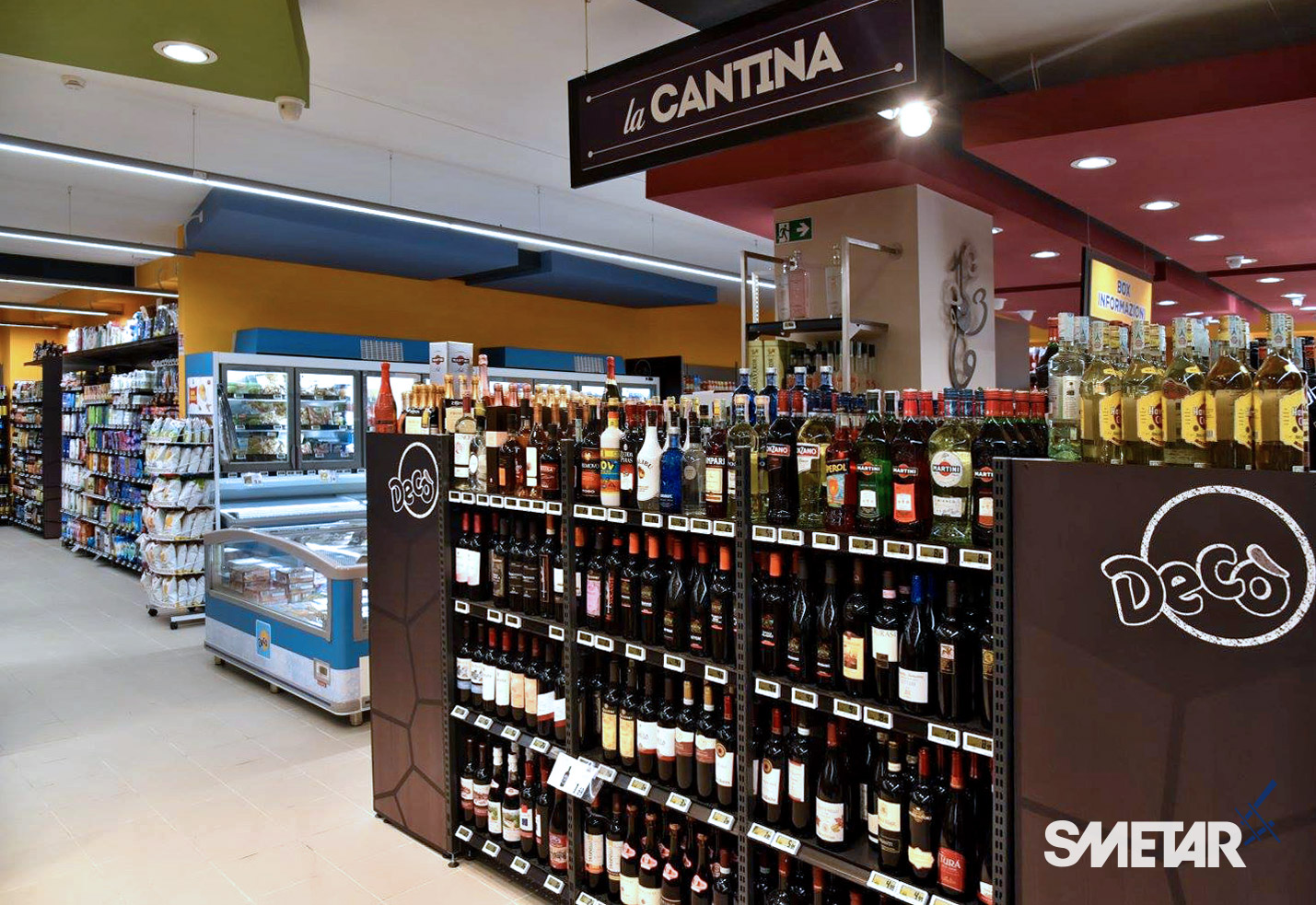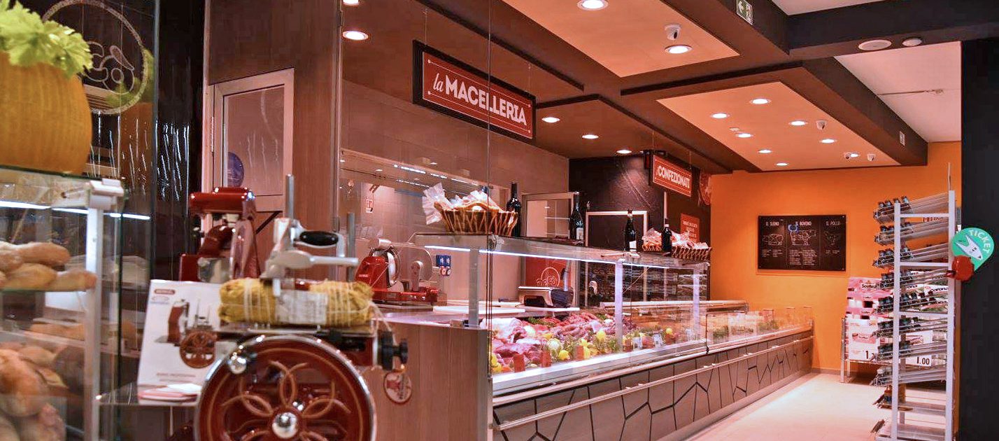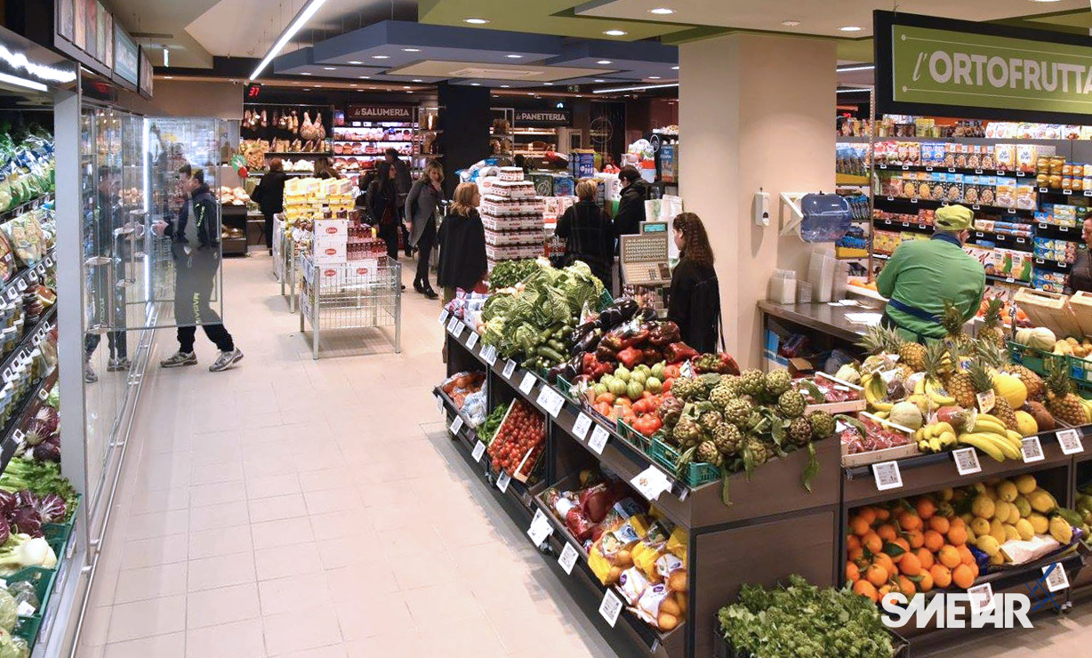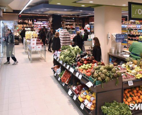 Il progetto iniziale di Smetar prevedeva la realizzazione di un punto vendita fresco ed innovativo, una quinta scenica d’impatto che mettesse in risalto i prodotti del territorio. Da qui la decisione di creare un layout suddiviso per aree dal colore diverso con un effetto prospettico, a partire dalla zona ortofrutta, per poi arrivare alla gastronomia/panetteria speculare alla macelleria, passando per l’area dei freschi, fino a giungere alla cantina predisposta di un mobile per la spillatura self-service dei vini, ed infine all’area casse.