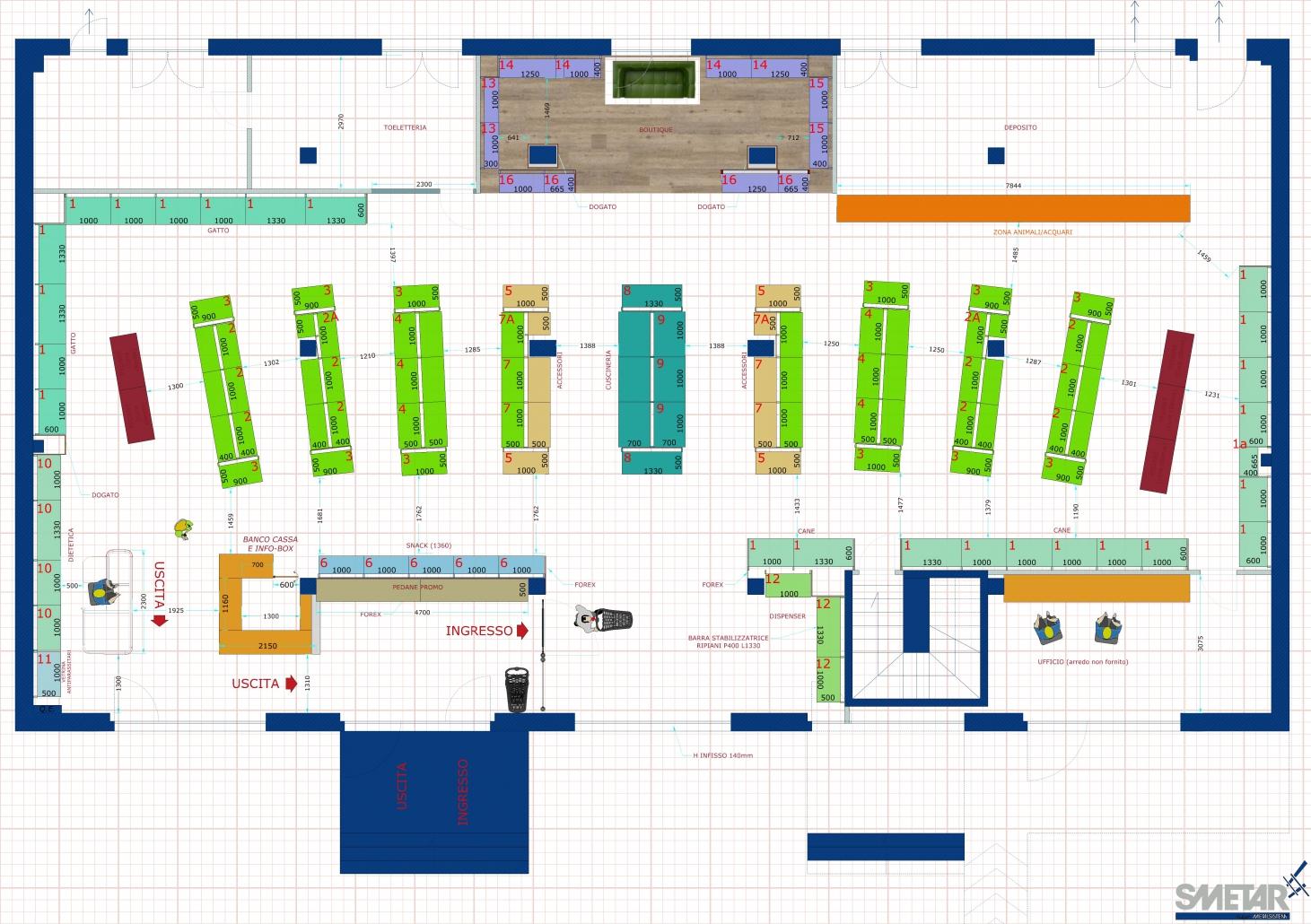 Smetar, nella progettazione di questo punto vendita, ha raccolto la sfida, impiegando il proprio reparto tecnico nella progettazione di un negozio altamente organizzato dal punto di vista funzionale, oltre dal forte impatto visivo.