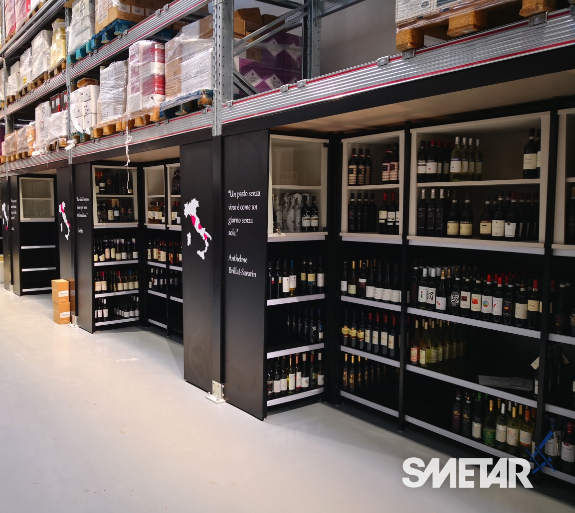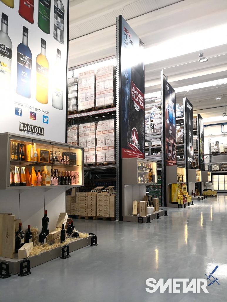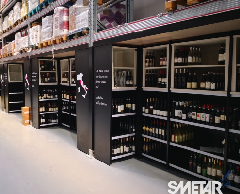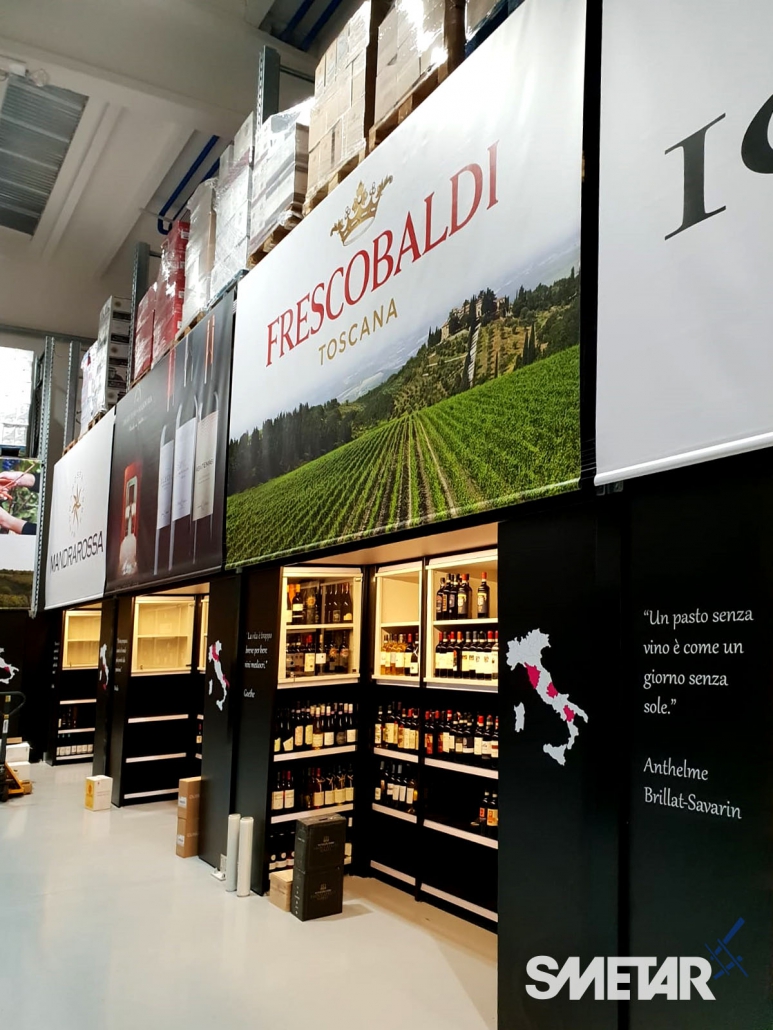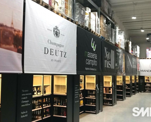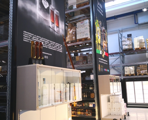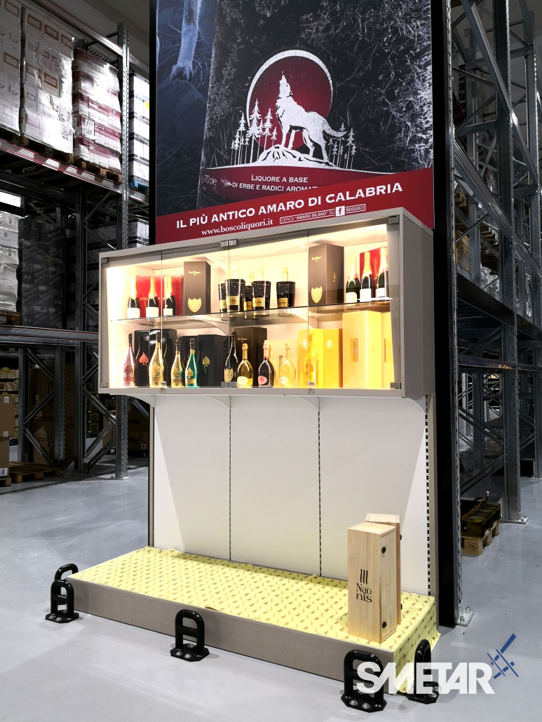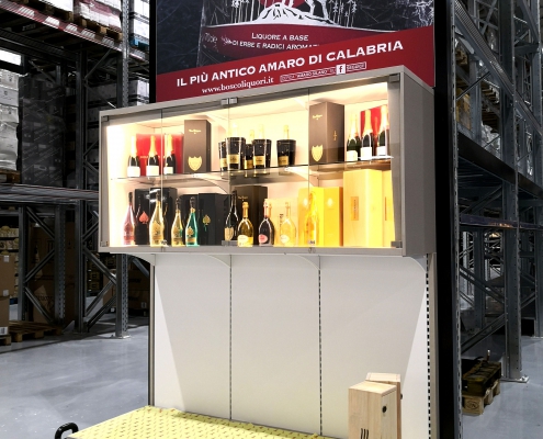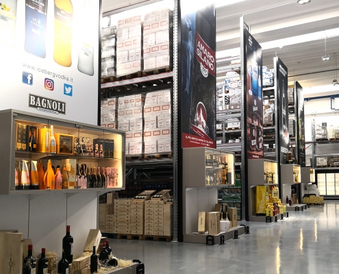 La scaffalatura porta-pallet superiore si arricchisce di apposite tende ad avvolgimento motorizzate che, allo stesso tempo, nascondono le scorte stoccate nella parte superiore, aumentano la resa estetica del punto vendita e mettono in risalto le cantine di punta grazie alla stampa grafica realizzata ad hoc.