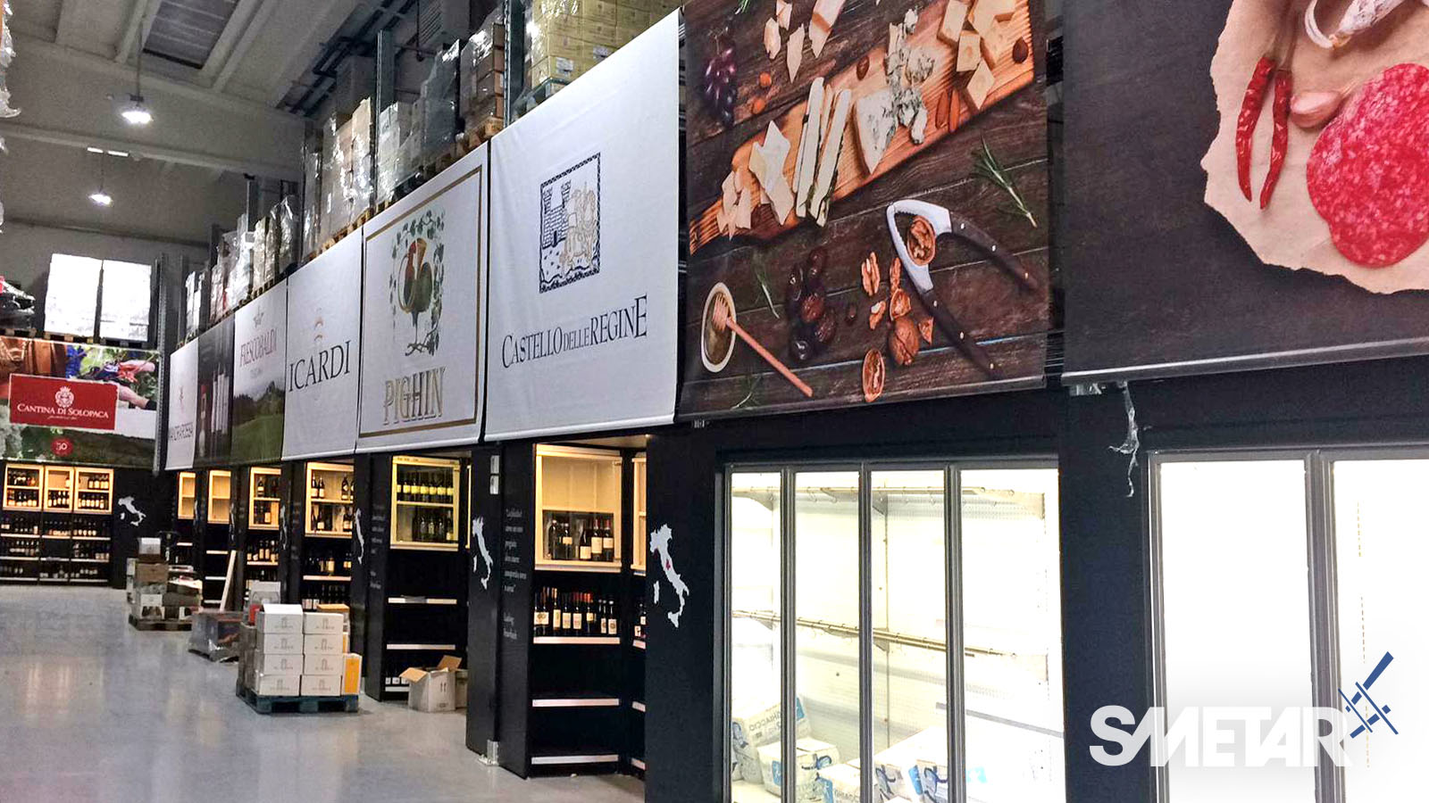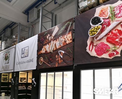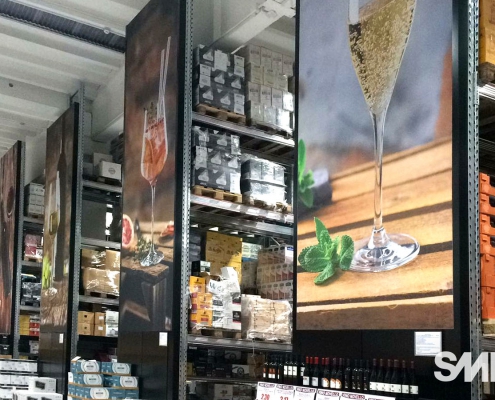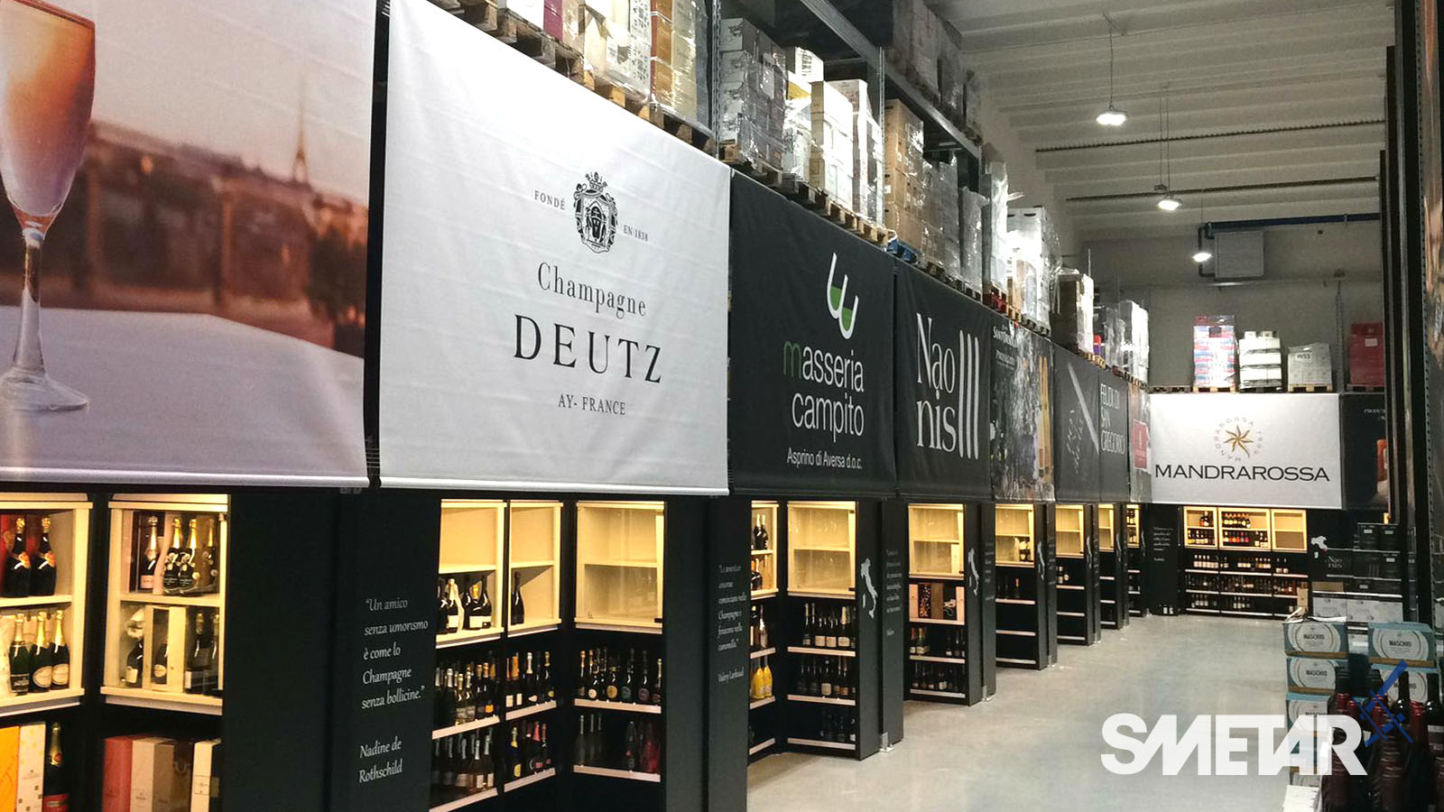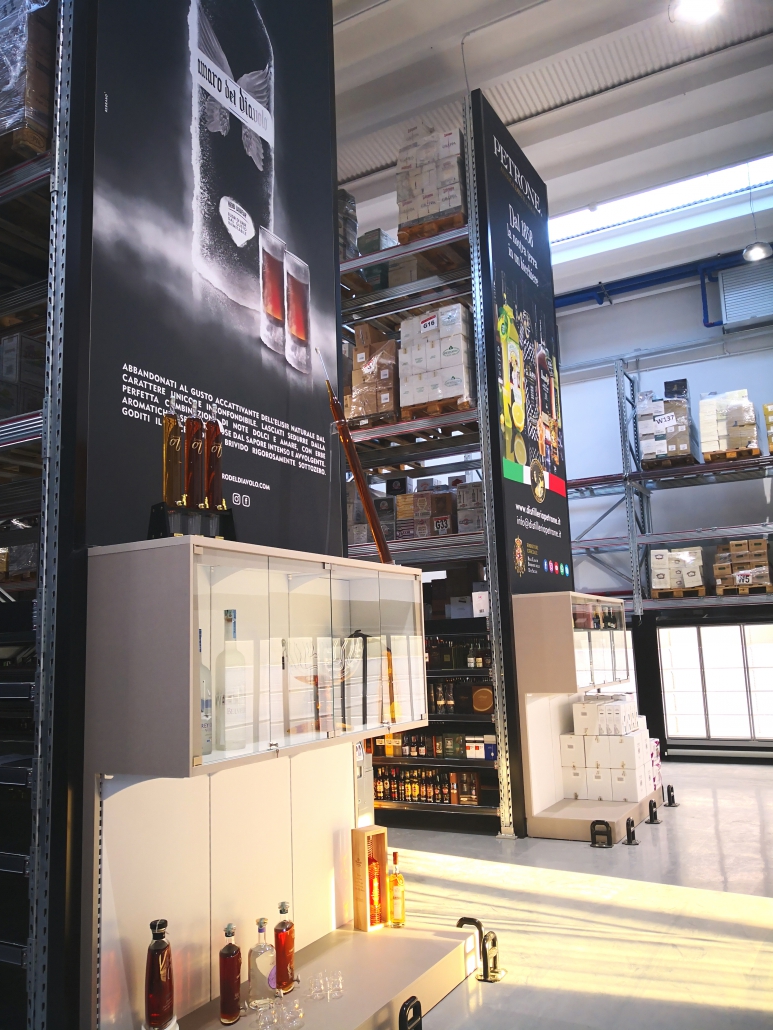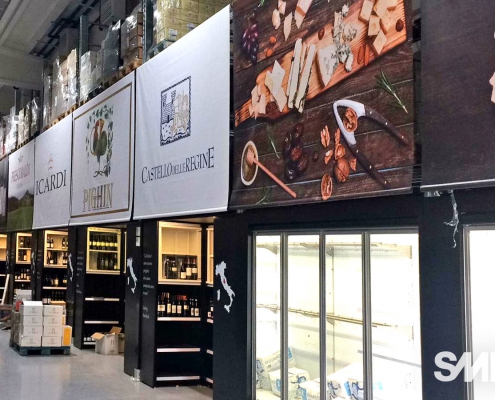 La scaffalatura porta-pallet superiore si arricchisce di apposite tende ad avvolgimento motorizzate che, allo stesso tempo, nascondono le scorte stoccate nella parte superiore, aumentano la resa estetica del punto vendita e mettono in risalto le cantine di punta grazie alla stampa grafica realizzata ad hoc.