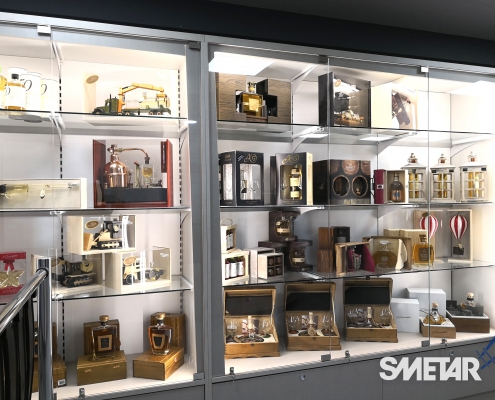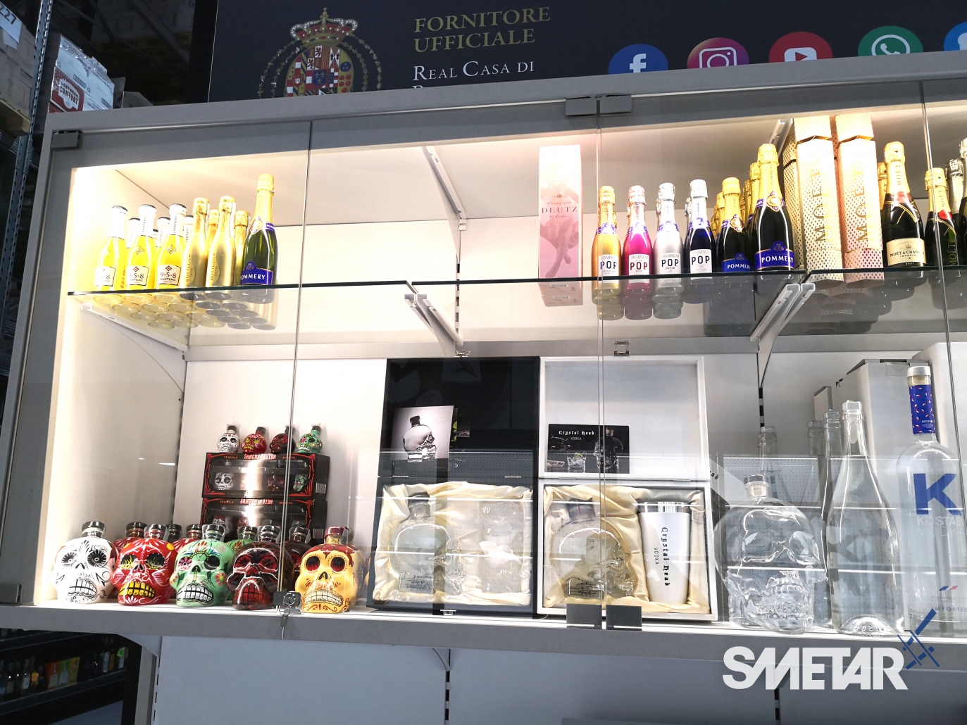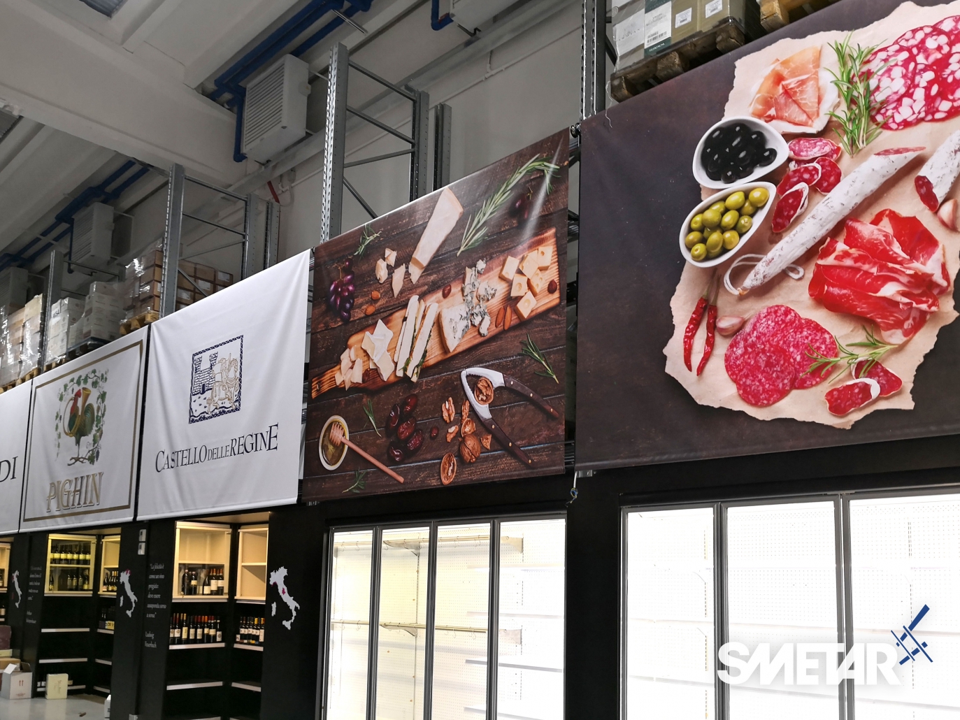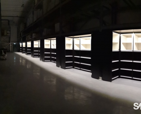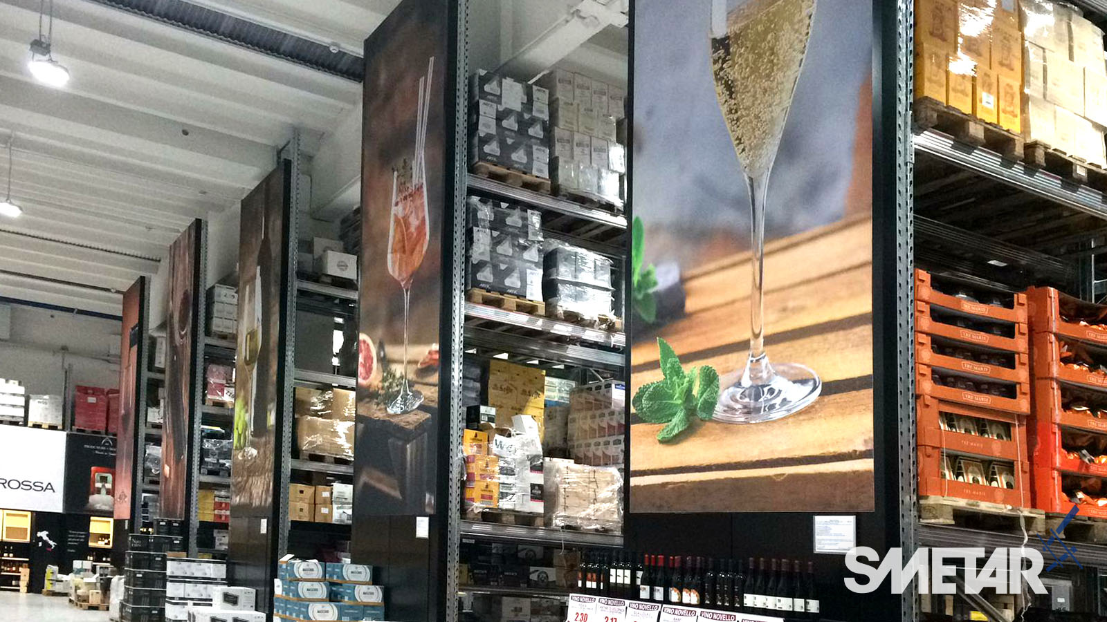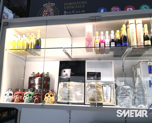 La scaffalatura porta-pallet superiore si arricchisce di apposite tende ad avvolgimento motorizzate che, allo stesso tempo, nascondono le scorte stoccate nella parte superiore, aumentano la resa estetica del punto vendita e mettono in risalto le cantine di punta grazie alla stampa grafica realizzata ad hoc.