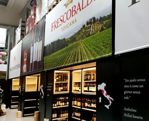 Per “incorniciare la scena” nel modo migliore, sono state create delle vere e proprie nicchie, nobilitate dall’uso del legno, perfettamente integrate nel punto vendita. Uno speciale impianto di illuminazione accoglie, in ogni nicchia, vini e spumanti provenienti da zone geografiche ben indicate e delimitate da una grafica installata sul fronte, che ha la duplice funzione di completare l’ambiente e di consentire al cliente di orientarsi in modo ottimale.