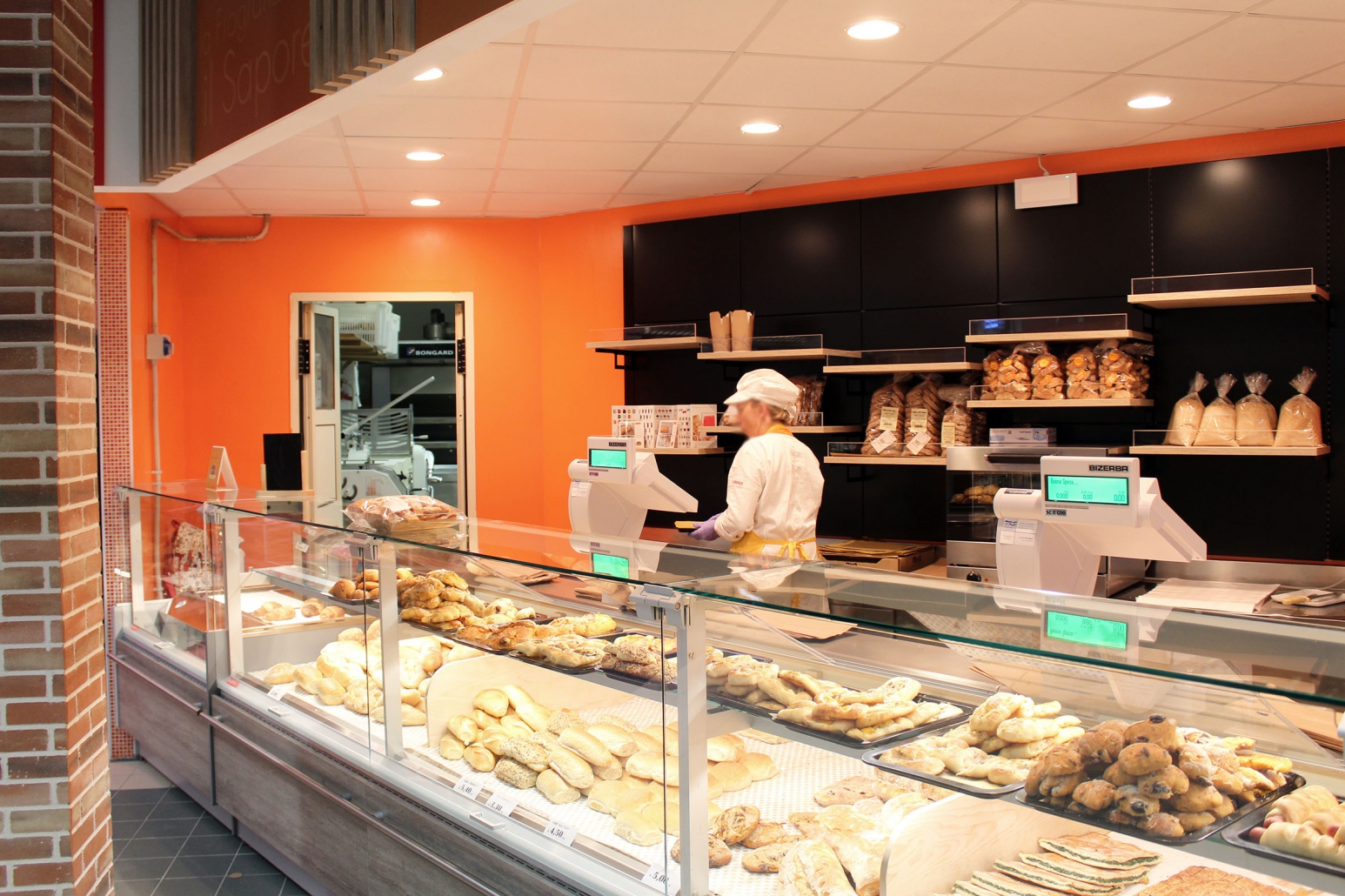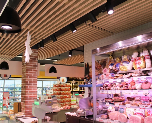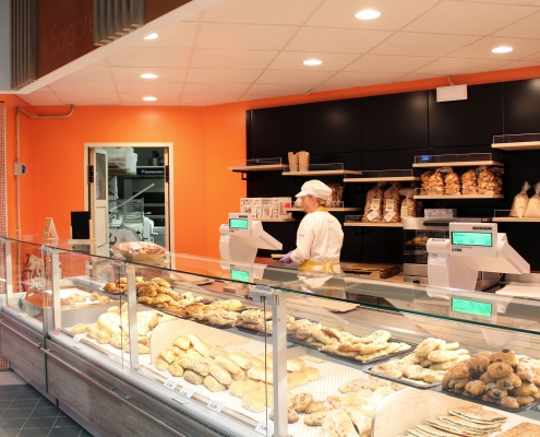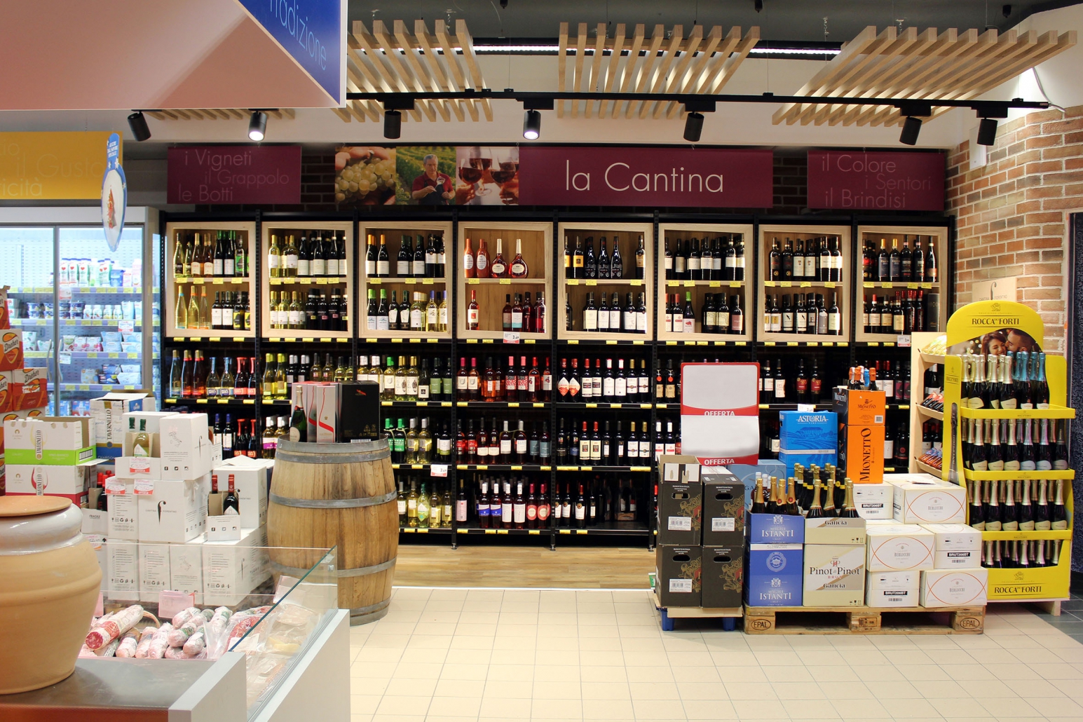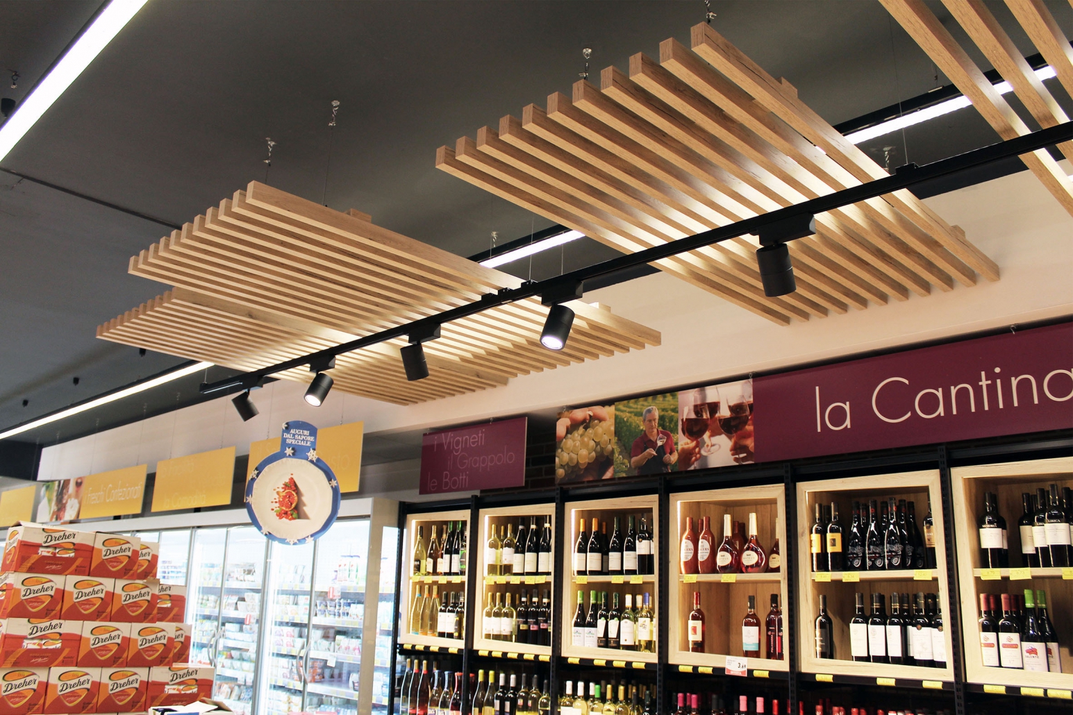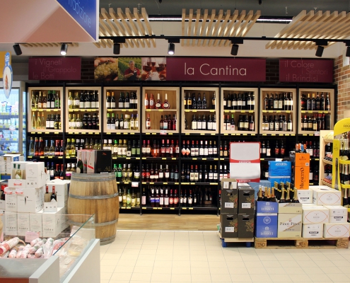 L’arredo della cantina è costituito da espositori in metallo verniciato nero, per una ulteriore valorizzazione dei prodotti sono corredati, nella parte superiore, da contenitori in legno chiaro con illuminazione led. Così come la panetteria composta da espositori in metallo verniciato nero e cassette portapane in legno chiaro.