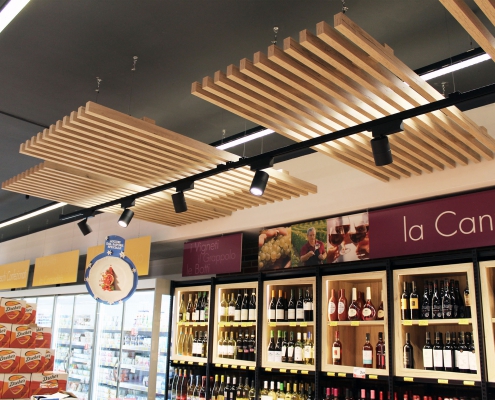 I soffitti vengono trattati con colore grigio scuro. Per caratterizzare e proporzionare lo spazio si impiegano elementi lineari in legno a sospensione, accostati e distanziati tra loro.