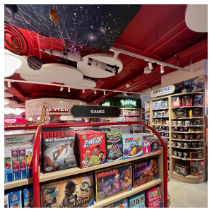 Il colore rosso, identità del marchio, aggiunge vitalità, mentre il legno contribuisce a creare un’atmosfera accogliente. La disposizione degli articoli, l’utilizzo sapiente del colore oro e l’illuminazione sono stati pensati e organizzati per stimolare l’interesse e suscitare meraviglia di grandi e piccini